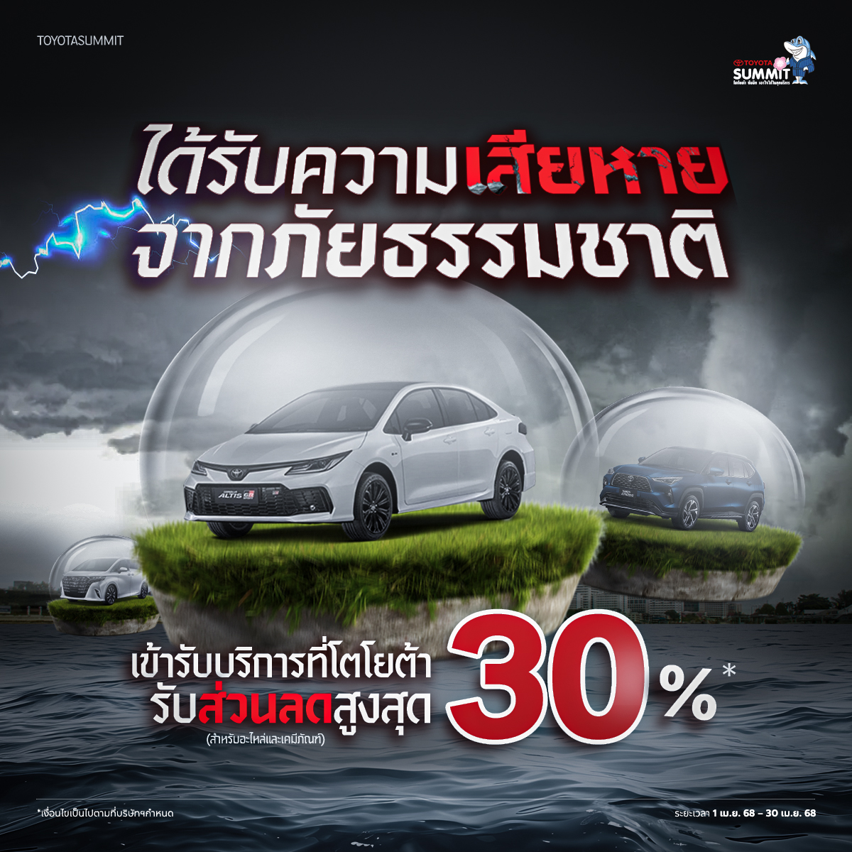 รถเสียหายจากภัยธรรมชาติไม่ต้องกังวล! เข้ารับบริการที่โตโยต้าซัมมิท รับส่วนลดสูงสุด 30%* ตั้งแต่วันที่ 1 เม.ย. 68 - 30 เม.ย 68